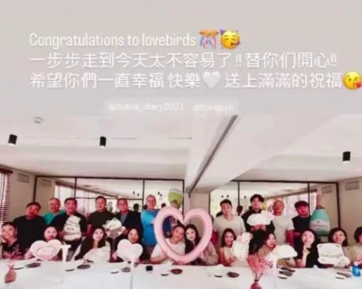 照片曝光,合影中两人亲密比心,身边都是亲友团,还有人留言“这一步走得真不容易”,配图却赫然是一对戒指。