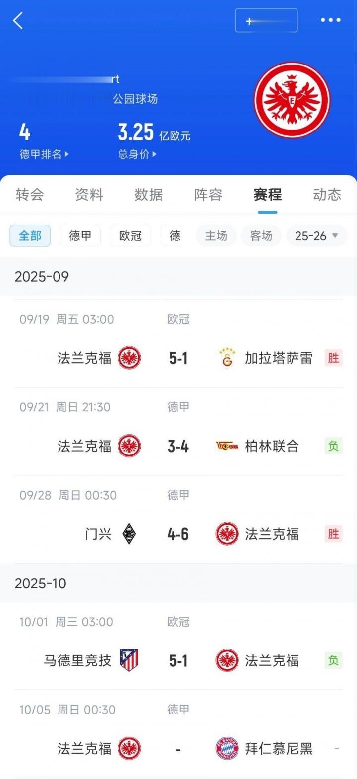 近4场比赛,法兰克福的战绩:5-1加拉塔萨雷,3-4柏林联合,6-4门兴,1-5马竞,每场比赛至少6球,不是你死就是我亡。下一场比赛,法兰克福主场迎战拜仁。
