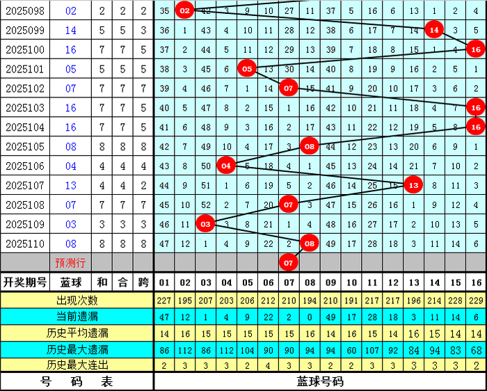 蓝球:上期蓝球号码为08,开出小 号、偶数,蓝球最近7期大小比为2:5,本期注意小 号蓝球出现,蓝球关注07。