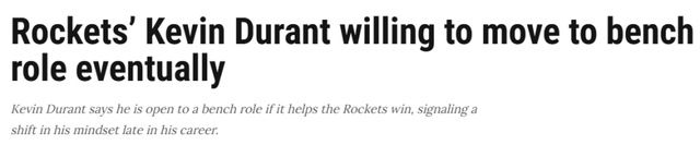对于杜兰特这样级别的球员而言,这番表态极为罕见。这位两届NBA总冠军得主、15次入选全明星的球星,长期以来都是以“首发核心的统治力”为标签。但他愿意接受更次要的角色,恰恰体现出他对自身状态的清醒认知,以及对延长职业生涯的考量。