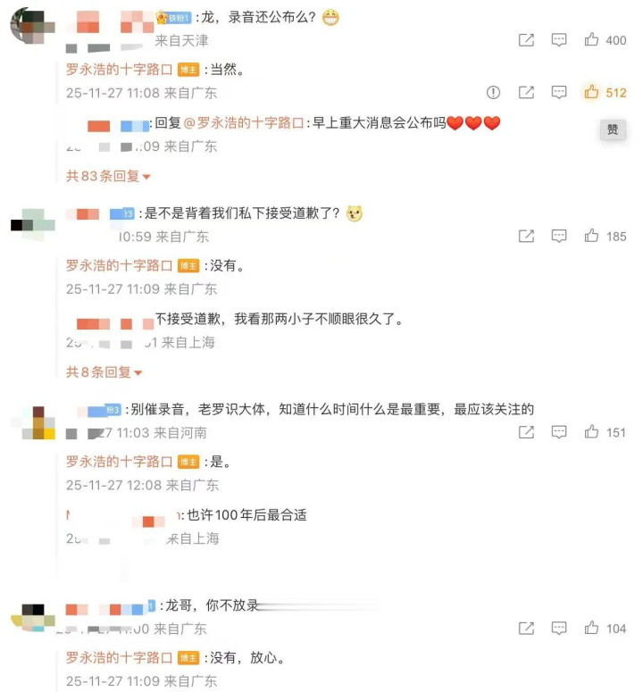 11月27日上午,罗永浩在微博更新了一条博文,有网友在评论区询问:“录音还公布么?”罗永浩回复称:“当然。”也有网友问:“是不是背着我们私下接受道歉了?”罗永浩回复称:“没有。”还有网友提问:“龙哥,你不放录音是不是被威胁了?”对此,罗永浩回复称:“没有,放心。”